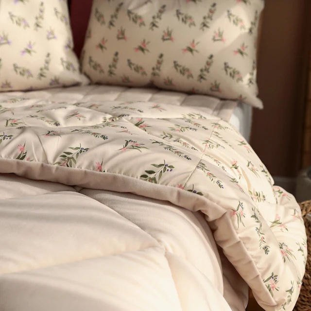 The Bebe Comforter & Pillow Set is designed with lightweight warmth and subtle botanical details to create a cozy, calming resting space filled with quiet charm. The front features smooth semi-nano microfiber, while the back is finished with plush microfiber fleece to help retain heat without feeling heavy. Filled with antibacterial corn-fiber insulation, it delivers cozy warmth with a breathable, manageable feel for everyday use.