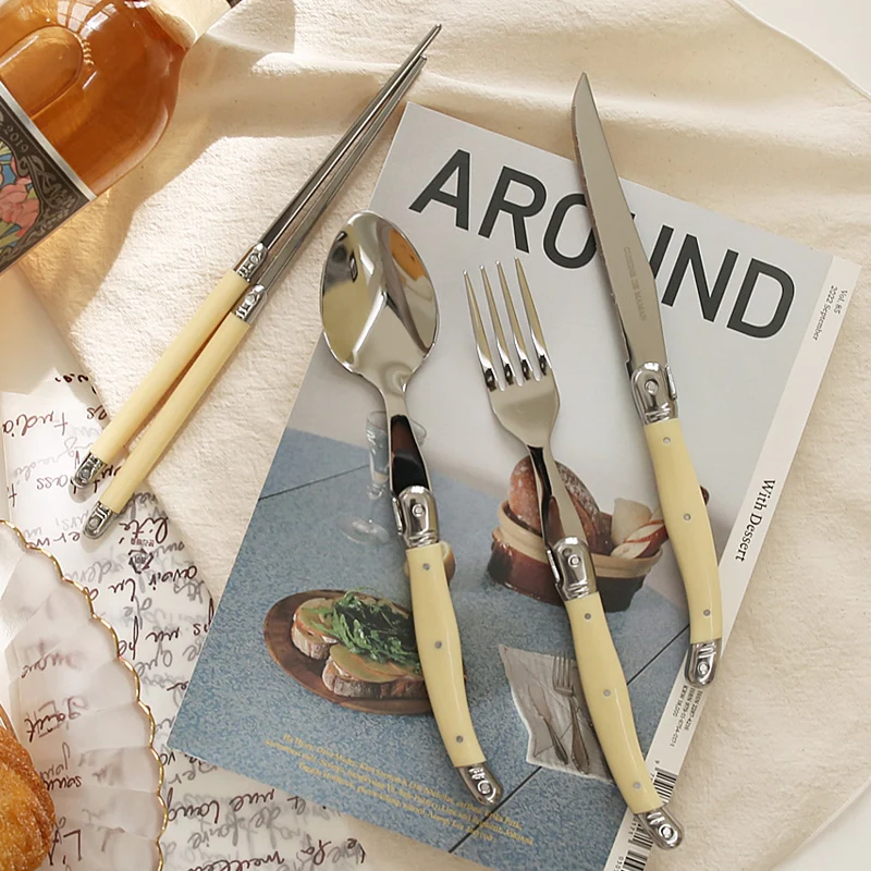This 6-piece cutlery set features vintage-inspired handles with a refined satin finish. Made from durable 304 stainless steel and accented with ABS resin handles, the set combines charm and utility for both casual dining and special occasions. Each piece is thoughtfully weighted for comfort and built to last.