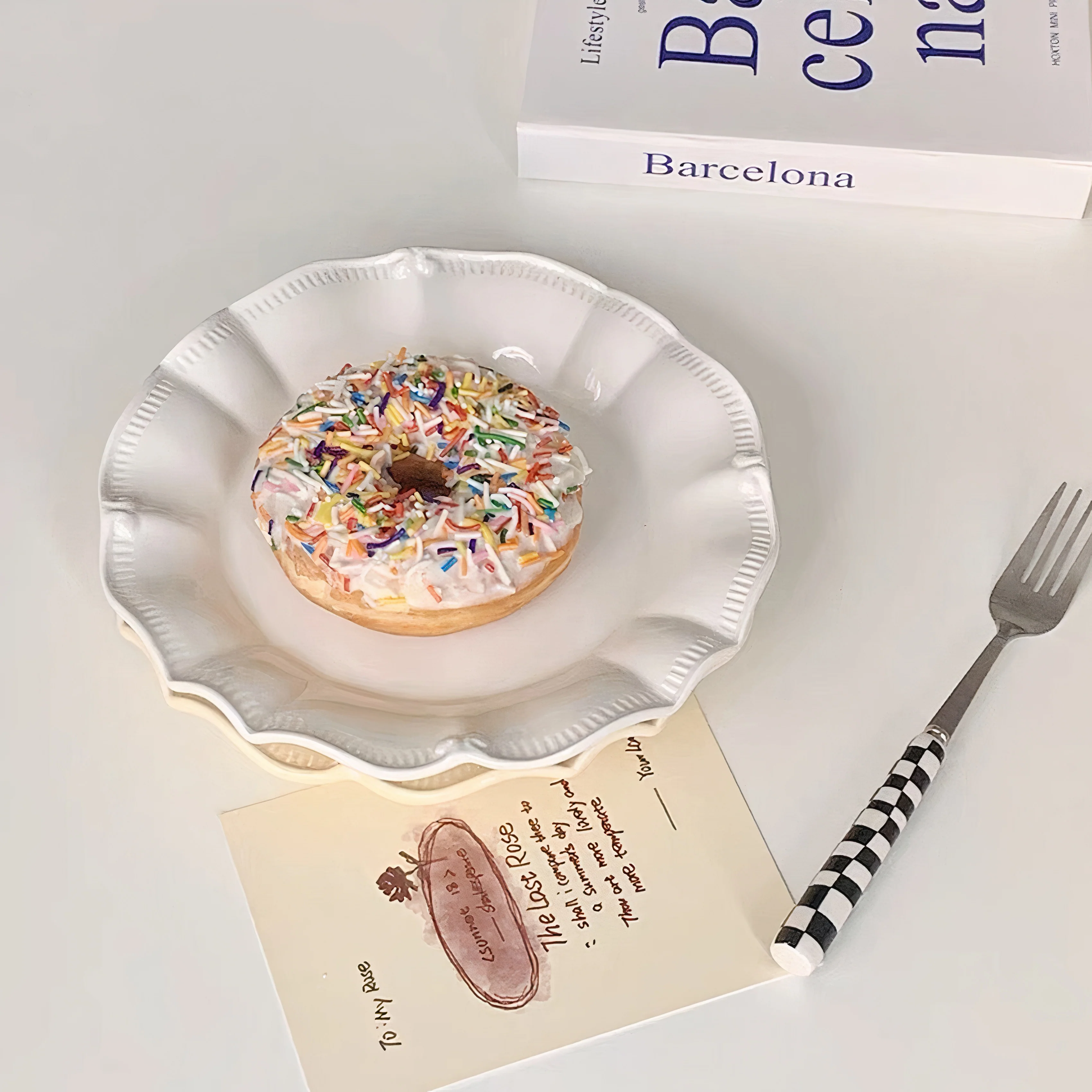 This ruffled ceramic dessert plate adds a touch of elegance to everyday treats. The subtle texture and refined edge give it a stylish presence without overwhelming the food. Whether you're serving pastries, bagels, or fruit, this plate keeps things simple yet elevated.