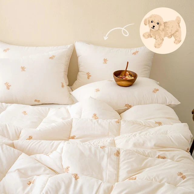 The lightweight Soft Cream Peach Comforter & Pillowcase Set is made with peach-finish fabric that feels soft and smooth against the skin. The gently brushed surface creates a subtle, velvety texture, while the microfiber filling adds light cushioning without extra weight. Featuring a sweet cream poodle print, this set brings a soft, lovable charm to your bedroom. Designed for comfort and practicality, it works beautifully as a year-round layer that keeps your space feeling clean and relaxed.