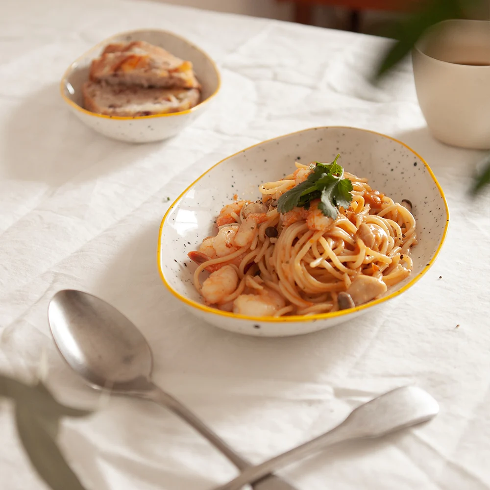 This speckled oval plate adds charm to your meals with its clean lines, subtle curve, and softly speckled surface. The lightweight ceramic design and dishwasher-safe finish make it easy to use every day. Ideal for one-dish meals, pasta, rice bowls, or saucy dishes that need extra depth.