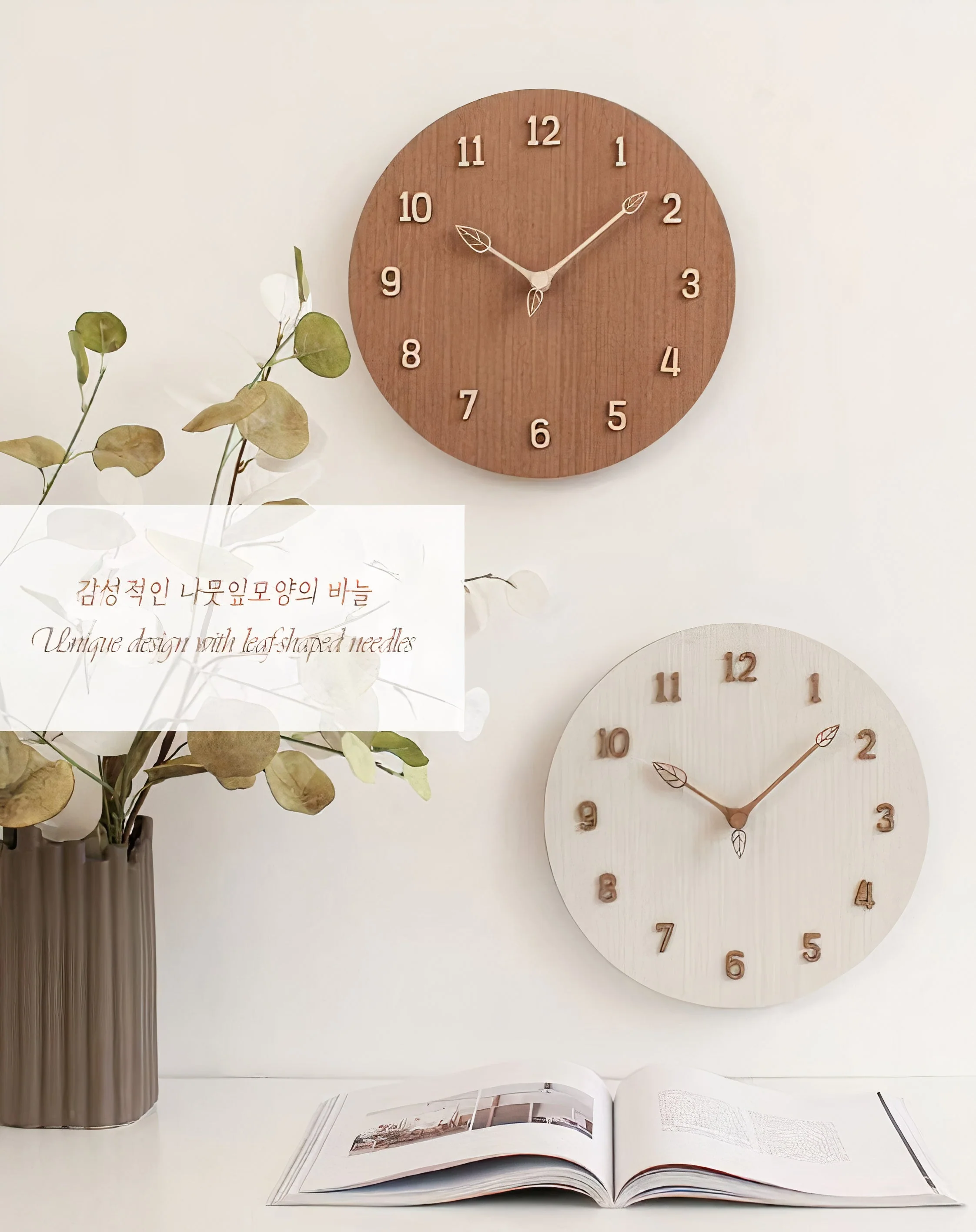 - Leaf-shaped clock hands for a subtle natural accent